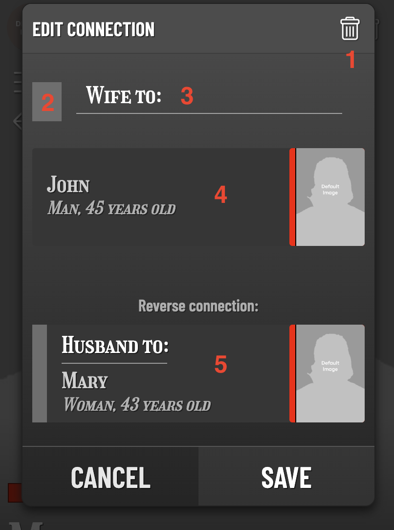 Connections is the relation between two items. It can be the relation between two people, or a person and a group, or a story and a city, etc etc.