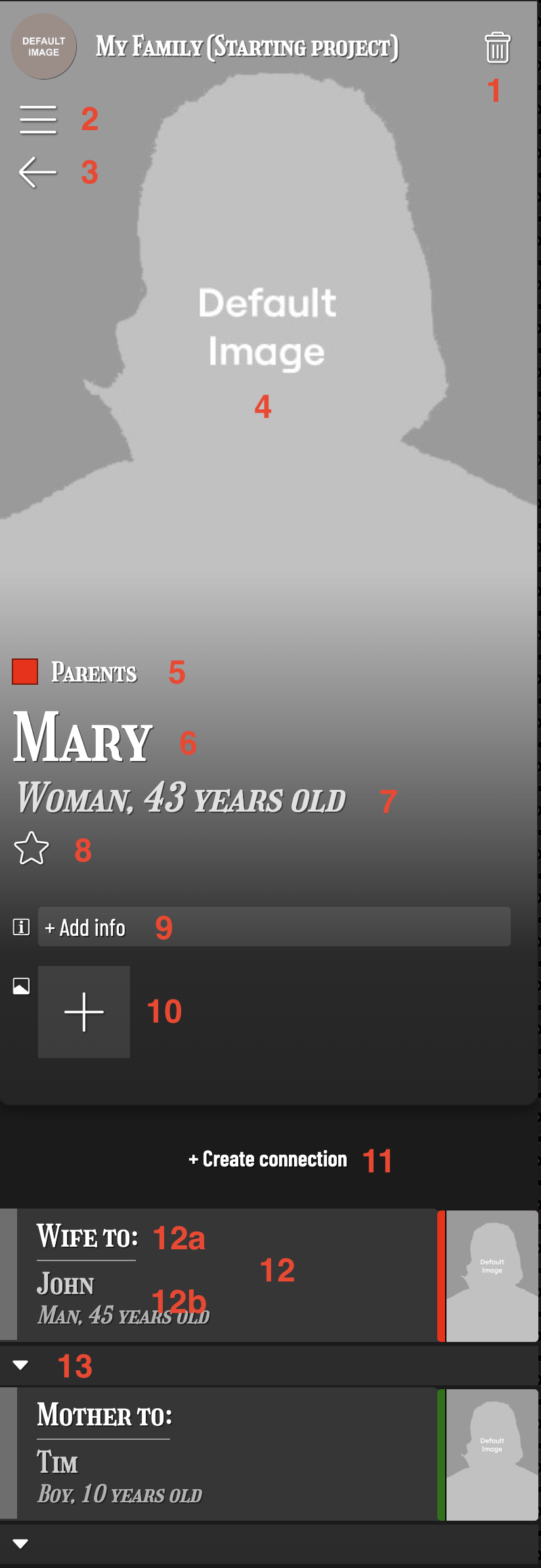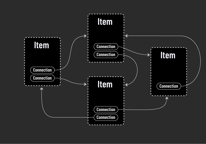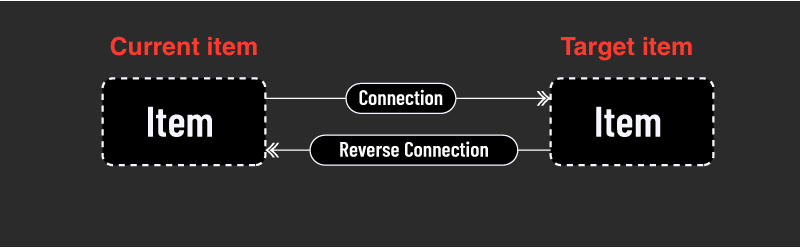 Two items can be linked by a Connection, that can be defined, for example as "mother to:" or "Customer to:" etc. A connection links the "current item" and a "target item" and can only be between two items.