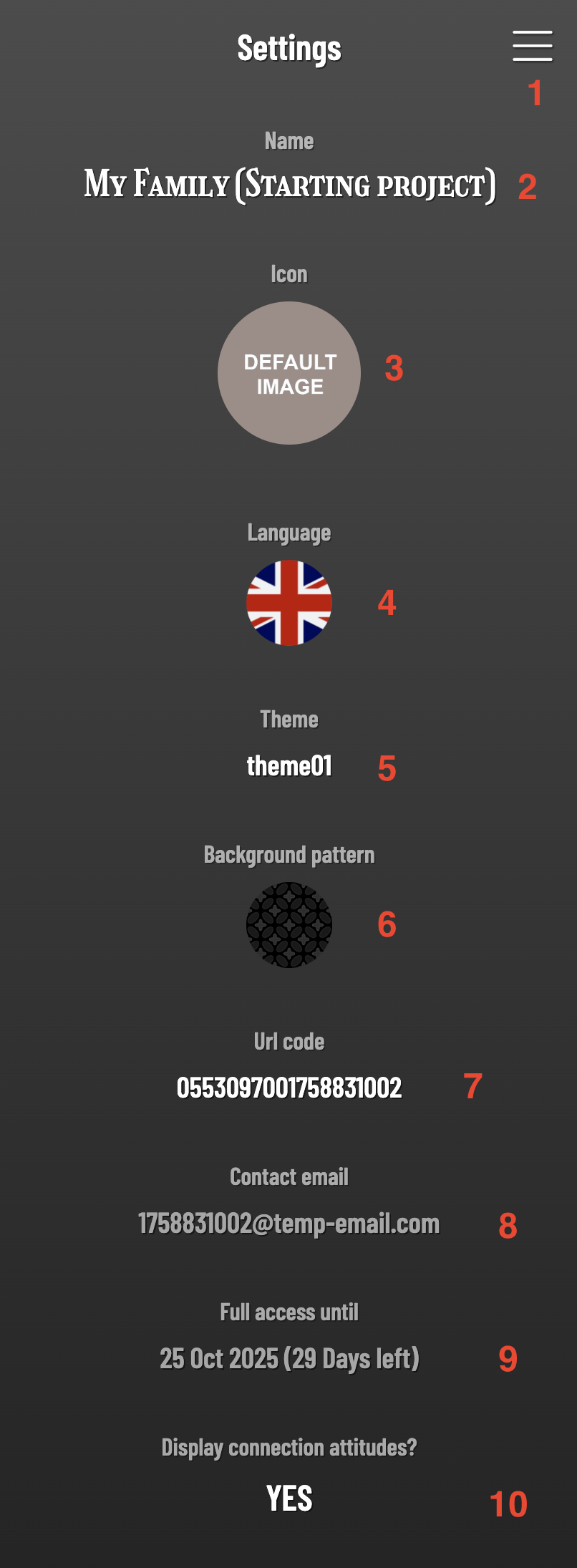 Clicking the project icon opens the project settings: