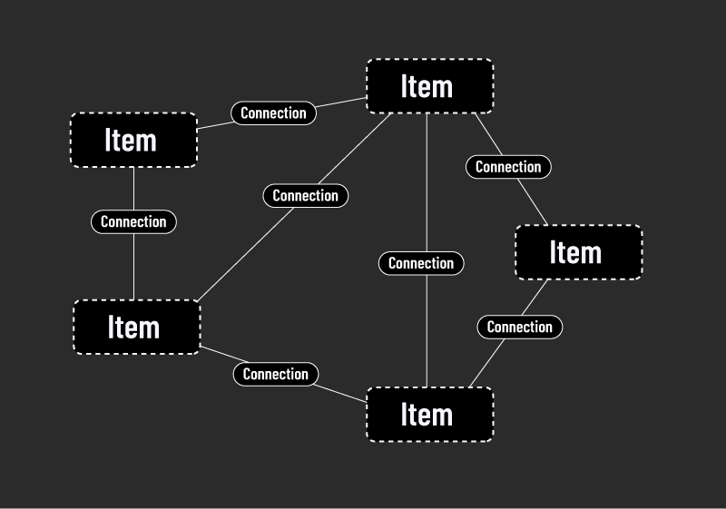 The system consists of two kinds of data: Items and connections. Items can be any kind of "thing"; a person, a group, an item, a story.. anything.