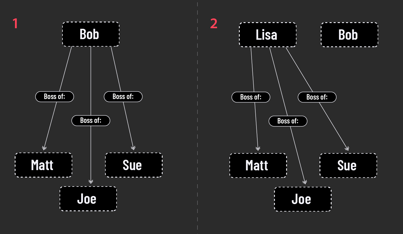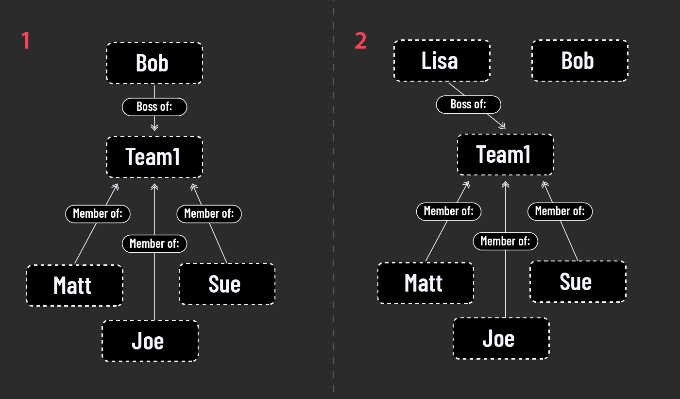 Imagine, for example, the below scenario: Matt, Sue and Joe are all in a team, with Bob as their boss. In the below situation, Bob is directly connected to all three(1), which makes it somewhat complicated when Lisa takes over the team (2), and all three connections have to be updated.
